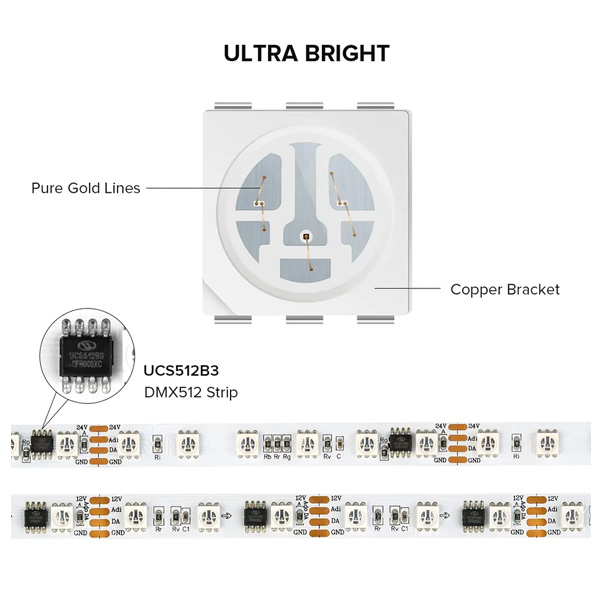DM512 Strip:The IC of the strip is UCS512B3. They can be controlled with a programmable controller or console.
